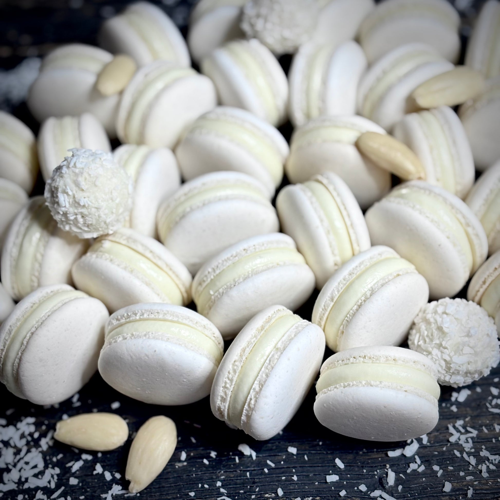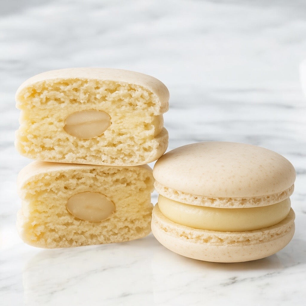 But there's more to this indulgence—nestled at the heart of each macaron is a surprise centre of blanched almonds, adding a delightful crunch that elevates the sensory experience.