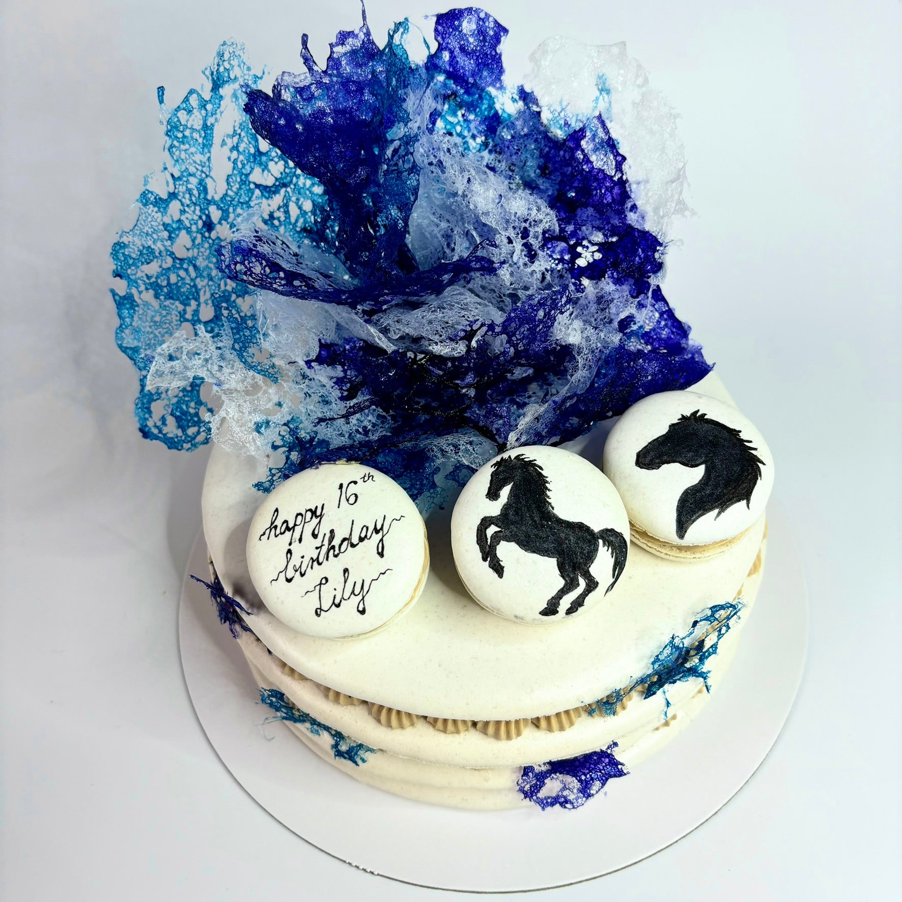 Our Macaron Cakes are created by stacking 2, 3 or 4 layers of delicious macaron shell (diameter ~ 16 cm) with 1, 2 or 3 layers of a scrumptious filling of your choice, decoratedĀ with wafer lace and personalised mini macarons.