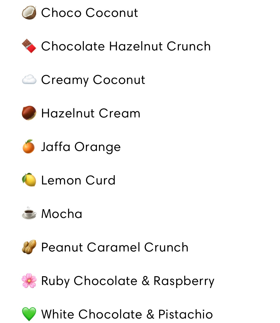 BOX OF 12: 1x Jaffa Orange, 1x White Chocolate & Pistachio, 3x Hazelnut Cream, 2x Choco Coconut, 2x Mocha, 1x Lemon Curd, 2x Ruby Chocolate & Raspberry