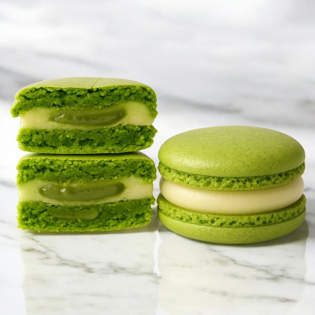 Delve into the exquisite world of our White Chocolate and Pistachio Macarons.